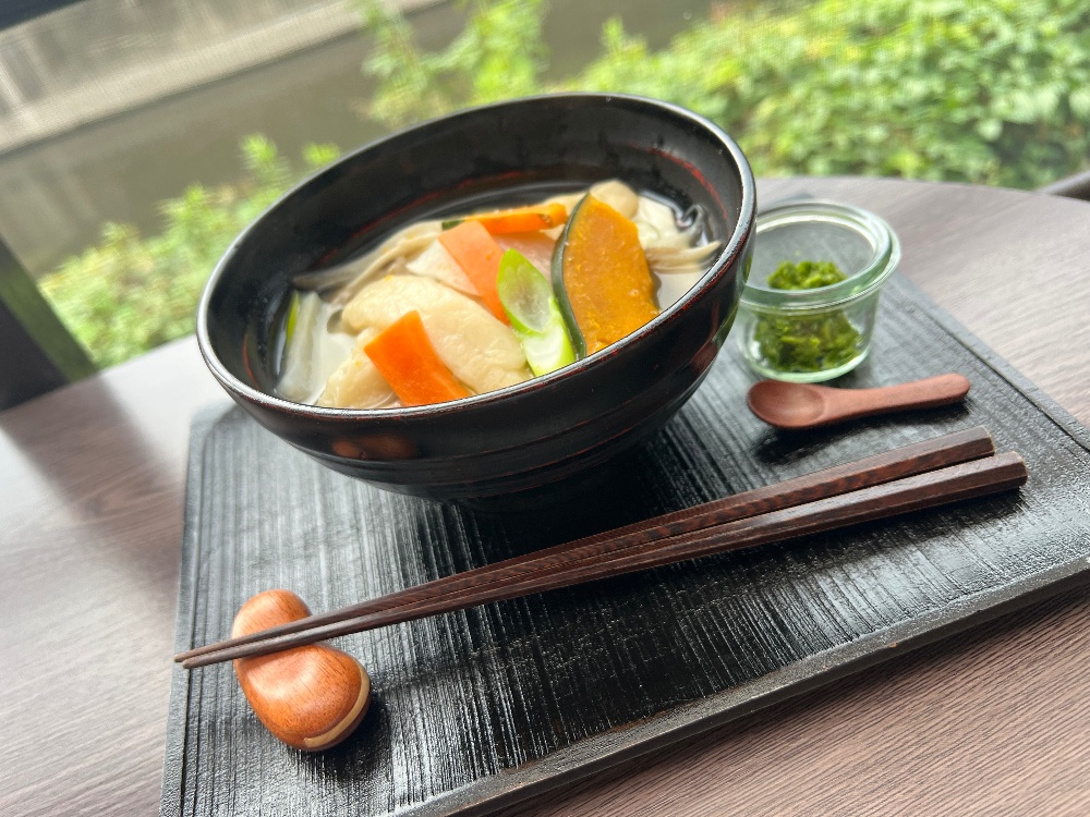 昆布と鰹節で出汁をとった素朴な味に仕上げました。だんごは白玉粉を配合してます。